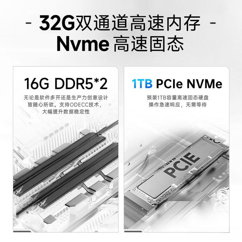 为了满足设计师和游戏玩家的需求,配置了32GB DDR5内存,让多任务处理变得轻松自如。无论在进行图形编辑、视频剪辑还是大规模游戏时,都会让你感受到高效能带来的极致体验,助力创意无限。